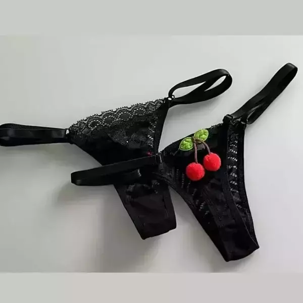 A calcinha fio dental string é a escolha perfeita para momentos de pura sensualidade. A parte da frente em renda com transparência valoriza o corpo de forma delicada e irresistível. Já a parte de trás, em tule macio, é finalizada com aplicações de cerejinhas trazendo um toque divertido e ousado.