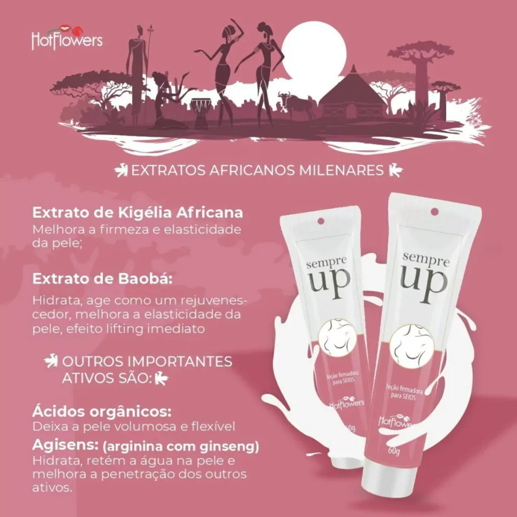 O Sempre Up funciona como uma espécie de tratamento para o busto em que o Firmador de Seios à Base de Extratos Naturais ativa a regeneração dos tecidos de sustentação, acelera a renovação celular, o que resulta em uma pele mais hidratada, firme e elástica.