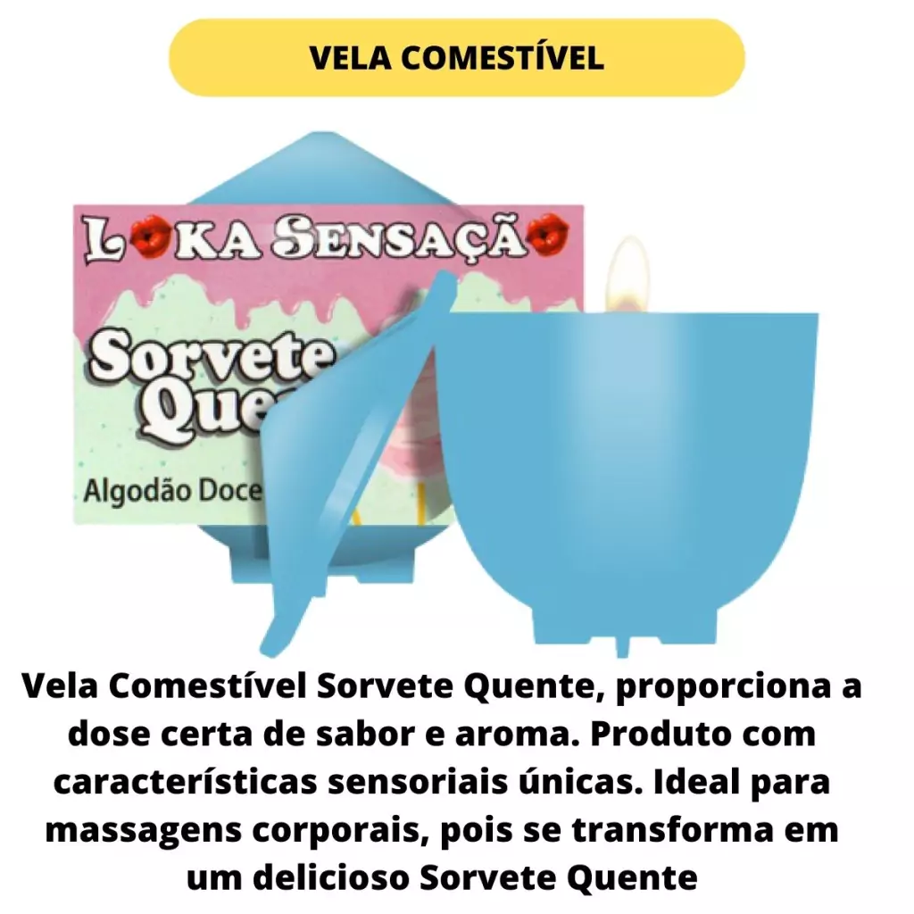 Vela Comestível Sorvete Quente, proporciona a dose certa de sabor e aroma. Produto com características sensoriais únicas. Ideal para massagens corporais, pois se transforma em um delicioso Sorvete Quente. Ingredientes que conferem nutrição e aroma agradáveis.