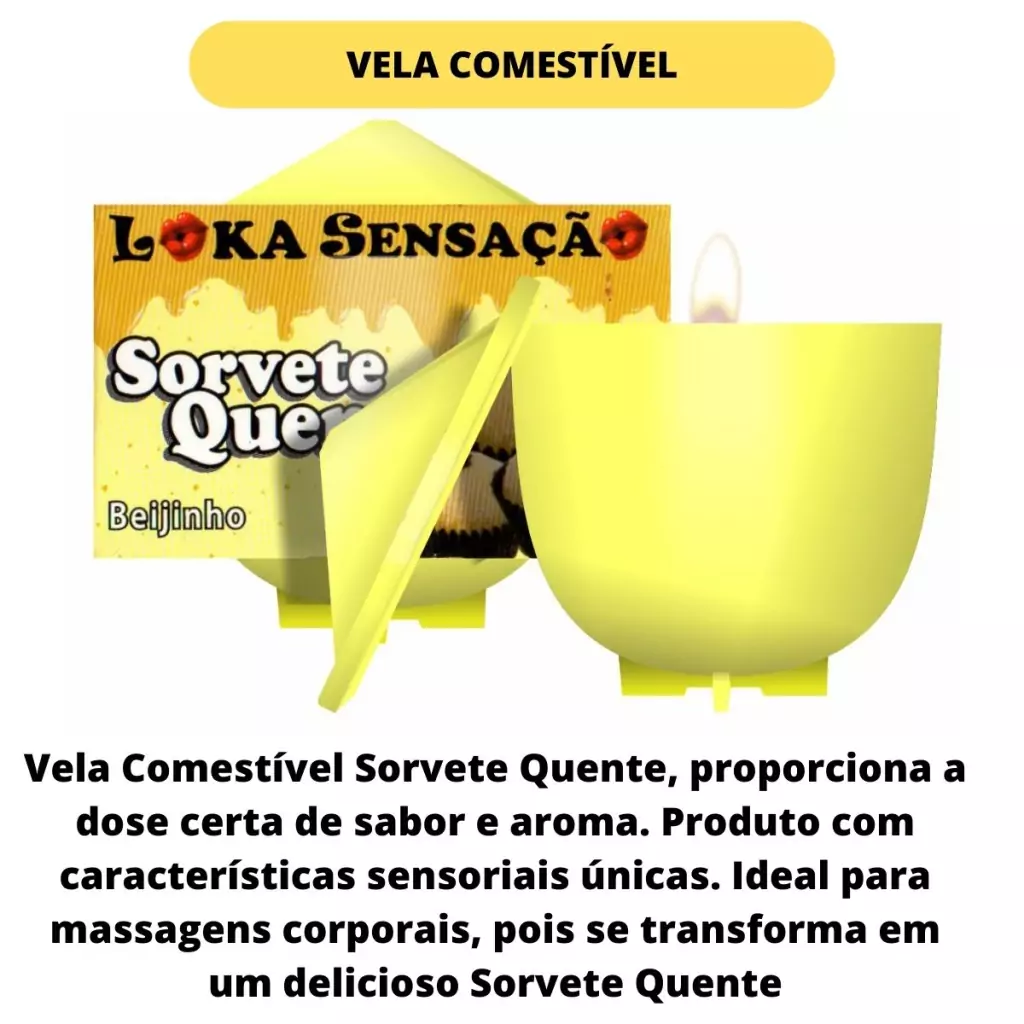 Vela Comestível Sorvete Quente, proporciona a dose certa de sabor e aroma. Produto com características sensoriais únicas. Ideal para massagens corporais, pois se transforma em um delicioso Sorvete Quente. Ingredientes que conferem nutrição e aroma agradáveis.